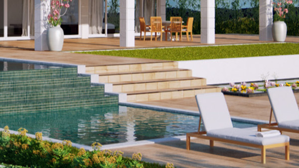 - Open courtyard with marble flooring and pond
